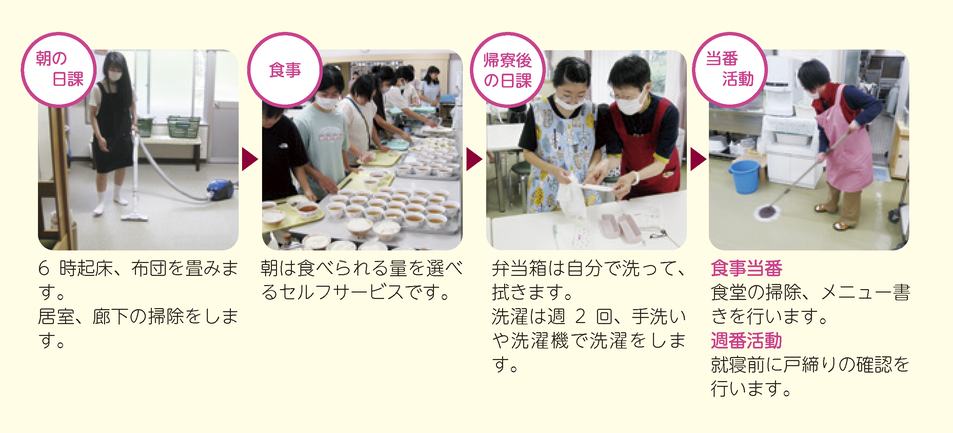 いずみ高等支援学校の「社会に役立つ人づくり」教育の重要な部門を受け持ち、生活指導を中心とした24時間体制のもと、集団生活を通し自立と生活力を高めることで、将来の社会参加を目指しています。