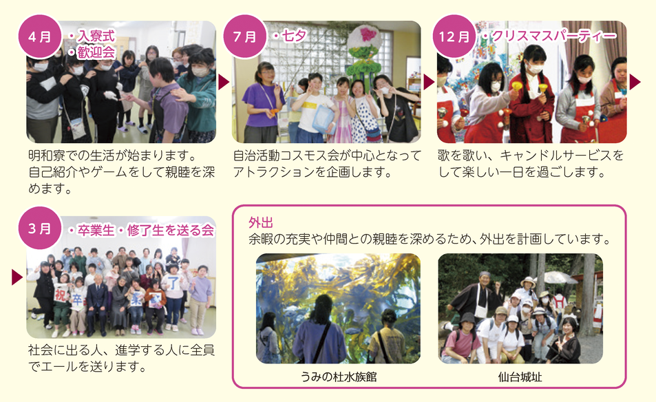 明和寮は、いずみ高等支援学校付設の寄宿舎で、「明和寮」と称し、学校設立当初から運営しています。仙台市北東部に位置し、学校まで徒歩10分~15分のところにあり、いずみ高等支援学校の寄宿舎として、広域から入寮の生徒が起居を共にしています。